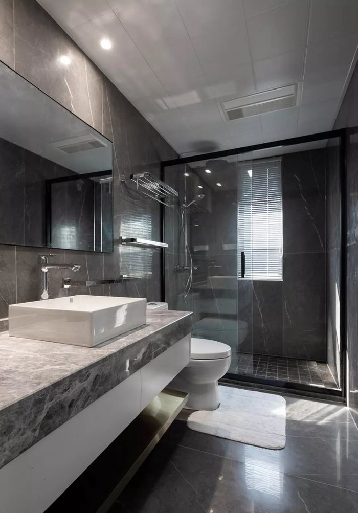 ▲ 客衛(wèi),墻地面通鋪灰色石紋磚,男主經(jīng)常出差喜歡酒店的臺(tái)盆處理,臺(tái)盆下方隔板采用不銹鋼材質(zhì)。