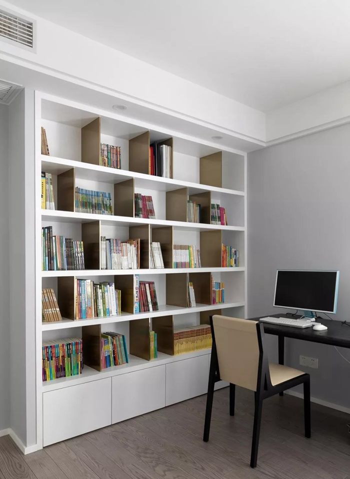 ▲ 書(shū)房,靠墻打造開(kāi)放式書(shū)架,豎向隔板采用金色不銹鋼處理。