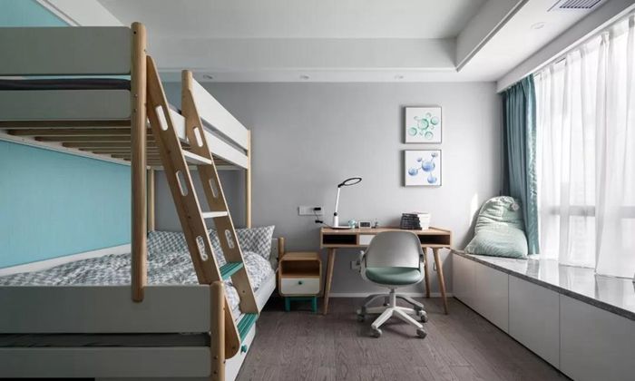 ▲ 溫馨又活潑的兒童房,高低床直角設(shè)計(jì)成圓弧造型,防止孩子磕碰,儲(chǔ)物飄窗成為休閑一角。