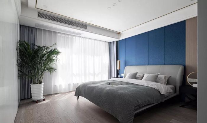 ▲ 床頭背景采用藍(lán)色硬包結(jié)合木飾面處理,木飾面轉(zhuǎn)角的延伸讓空間更有層次。