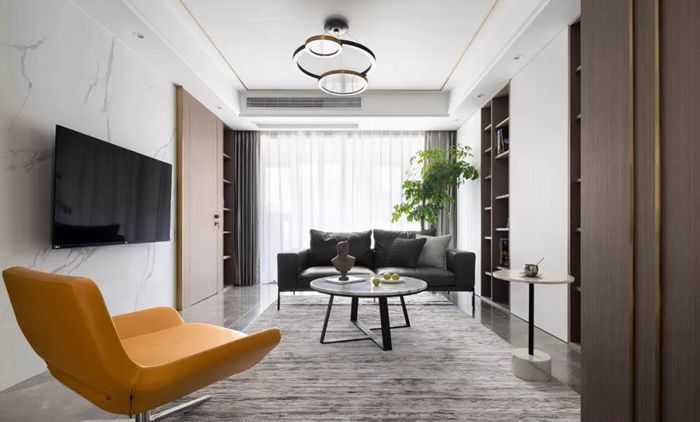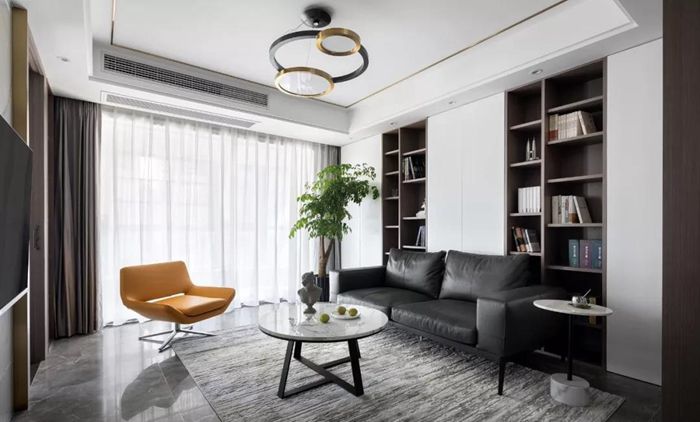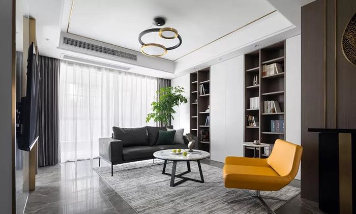 ▲ 取消傳統(tǒng)沙發(fā)正對(duì)電視的擺放,滿(mǎn)足了屋主對(duì)于互動(dòng)交流以及閱讀收納的需求。