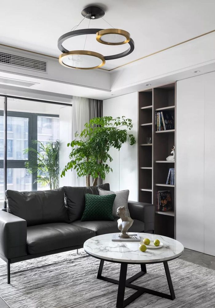 ▲ 打造收納型背景墻,半開(kāi)半合的設(shè)計(jì),收納與展示并存,角落的大株綠植為空間帶來(lái)生機(jī)。