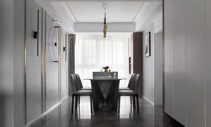 ▲ 大理石餐桌搭配灰色系軟包餐椅,一旁的島臺(tái)滿(mǎn)足餐邊收納。