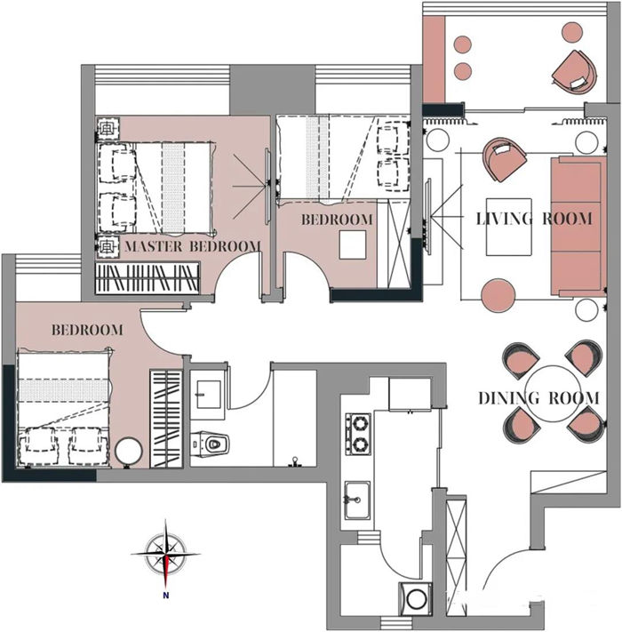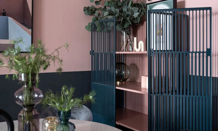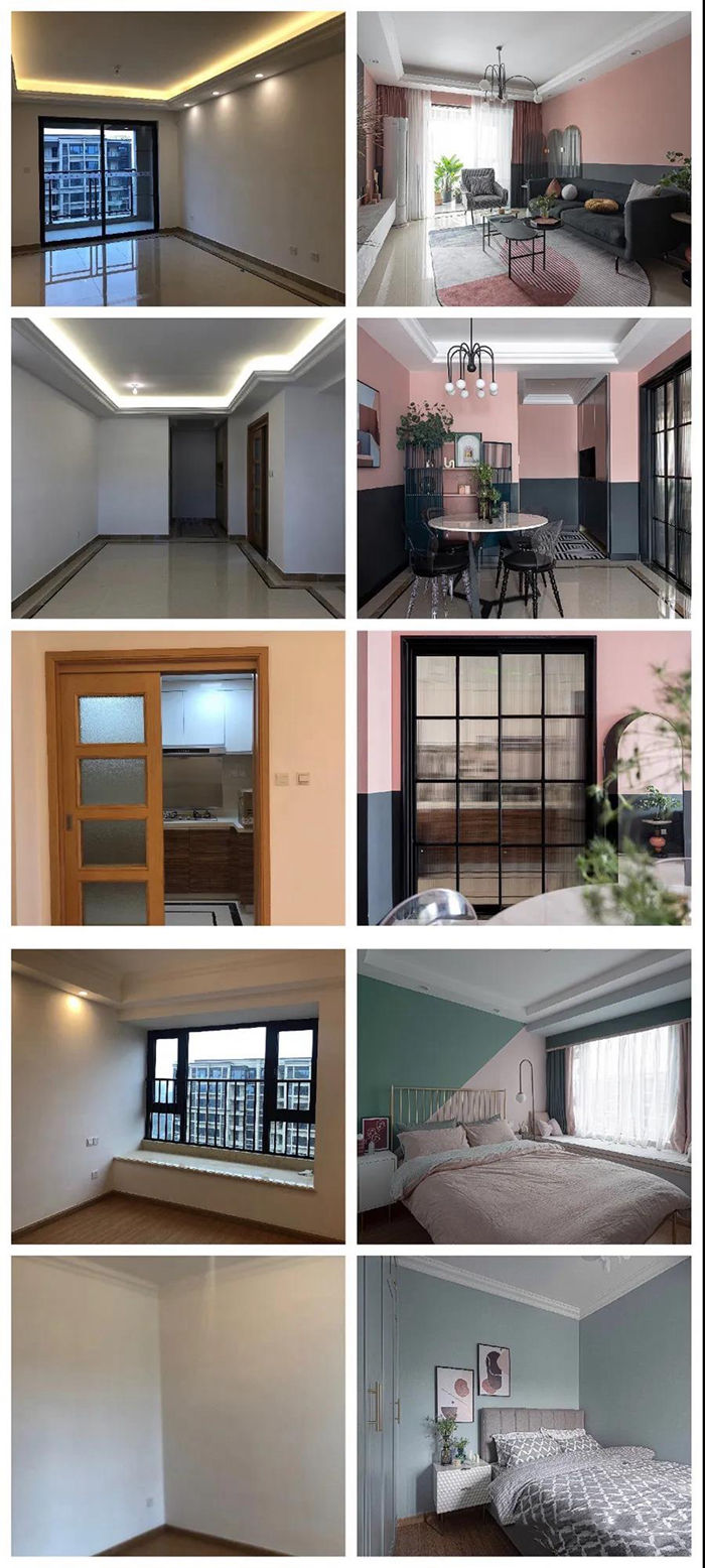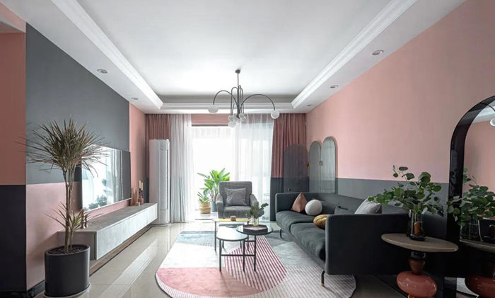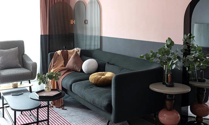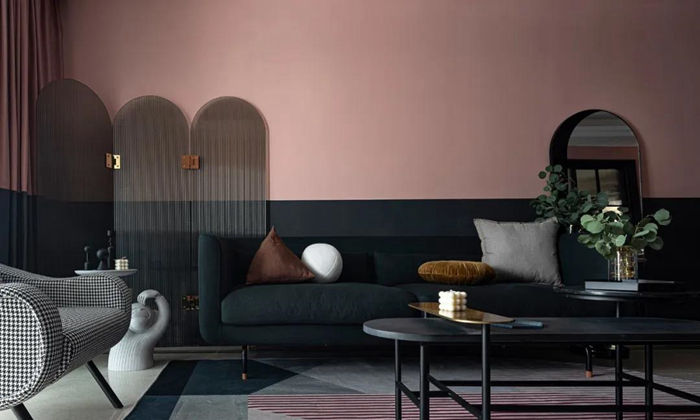 ▲ 入戶的柜體更換柜門,讓柜體的顏色和整屋墻面分色統(tǒng)一,視線感拉長,空間得到延伸,全屋用灰粉色和黑色墻漆上下分色的方式來營造復(fù)古感,通過大面積的色彩帶來視覺沖擊力。
