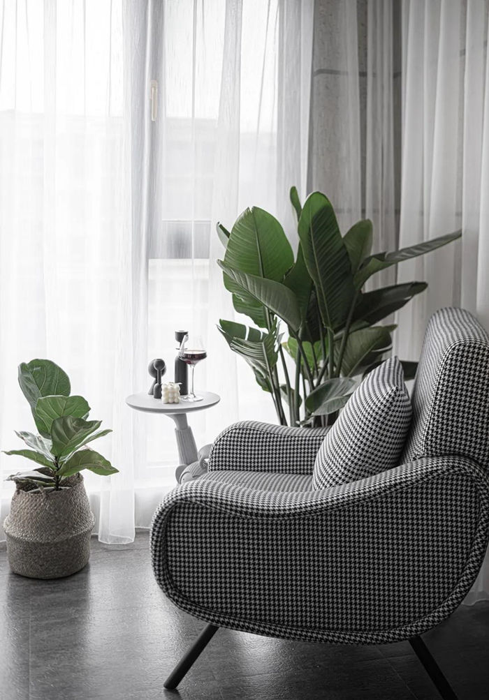 ▲ 在重色的家居軟裝搭配中,加入千鳥格布藝單椅,淺色的視覺可以輕易跳出來。