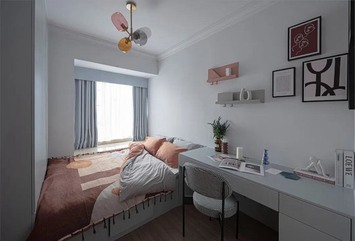 ▲ 次臥,考慮到父母偶爾過來住,或者朋友過來住的臨時空間,保留傳統(tǒng)的床,滿足基本的睡覺和儲藏衣服的功能即可