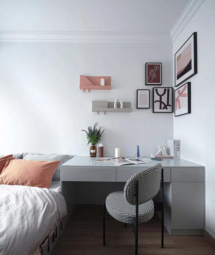 ▲ 灰色家具搭配白色墻面,墻面采用色彩藝術(shù)裝飾畫與有色隔板修飾。