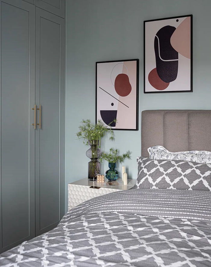 ▲ 主臥背景墻面延續(xù)分色處理,同樣沒有再進行掛畫,而是把掛畫通過擺件的手法擺放在床頭柜上,搭配個性化的臺燈和手工藝蠟燭都融合功能和視覺的效果。