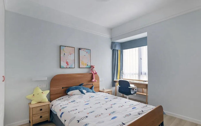 ▲ 兒童房,淺色系墻面搭配原木家具,點(diǎn)綴童趣床品與裝飾畫,利用原始飄窗位置規(guī)劃為學(xué)習(xí)區(qū)。