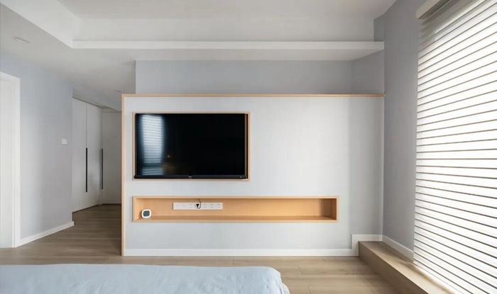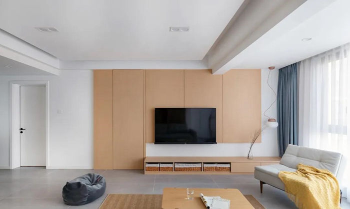 ▲ 電視背景墻為現(xiàn)場(chǎng)木作,左側(cè)設(shè)計(jì)兒童房隱形門,下方設(shè)置儲(chǔ)物地臺(tái)取代傳統(tǒng)電視柜的功能。