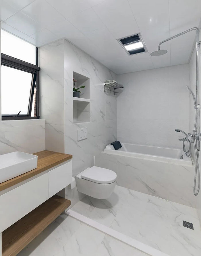 ▲ 主衛(wèi),白色石紋磚墻地一體,木色浴室柜增添暖意,馬桶上方制作實(shí)用壁龕。