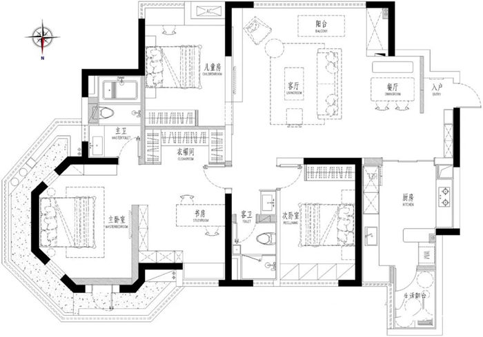 ▲ 使用面積140平,女業(yè)主是一名自由職業(yè)者,男業(yè)主是一名游戲美術(shù)設(shè)計(jì)師,玄關(guān)新建造型隔斷既保證了玄關(guān)的采光與使用,同時(shí)增加了客廳整體使用面積。