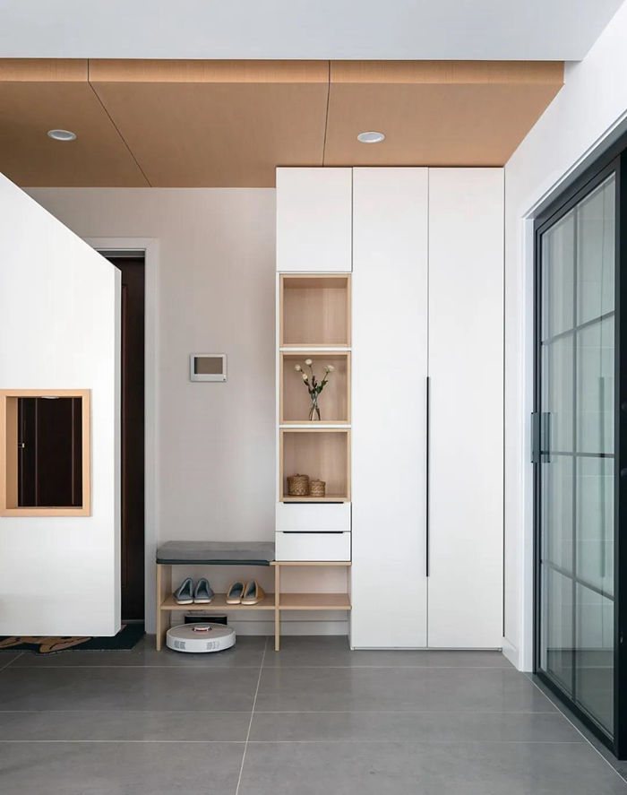 ▲ 入戶鞋柜與換鞋凳一體設(shè)計(jì),下方預(yù)留了家居鞋和掃地機(jī)器人的置放位置。