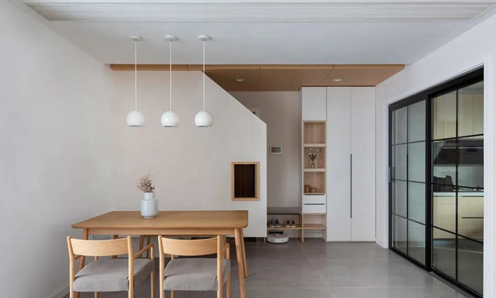 ▲ 拆改墻體后,增加的客廳面積作為餐廳區(qū)域使用,一套簡(jiǎn)約的餐桌椅滿足基本就餐需求,旁邊就是寬敞的廚房,空間動(dòng)線流暢。
