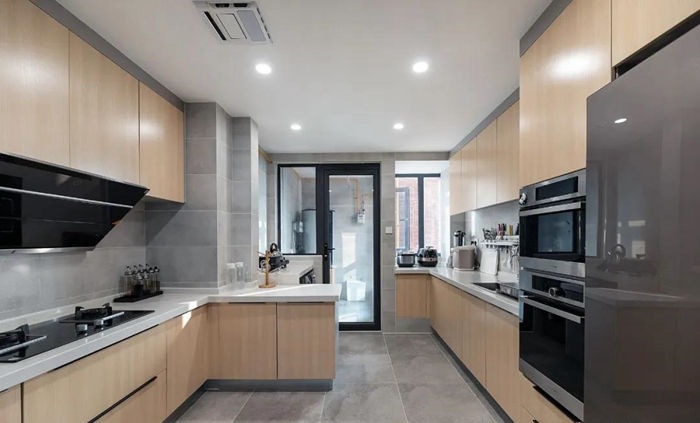 ▲ 廚房納入陽臺(tái)一部分空間,增大廚房使用面積,整體定制木色櫥柜,灰色墻地磚耐臟易打理。