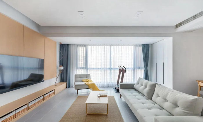▲ 客廳納入陽臺(tái)規(guī)劃健身區(qū),平時(shí)可以折疊收納到陽臺(tái)的柜體里隱藏起來,使整個(gè)空間做到隨用隨取,時(shí)時(shí)保持整潔。