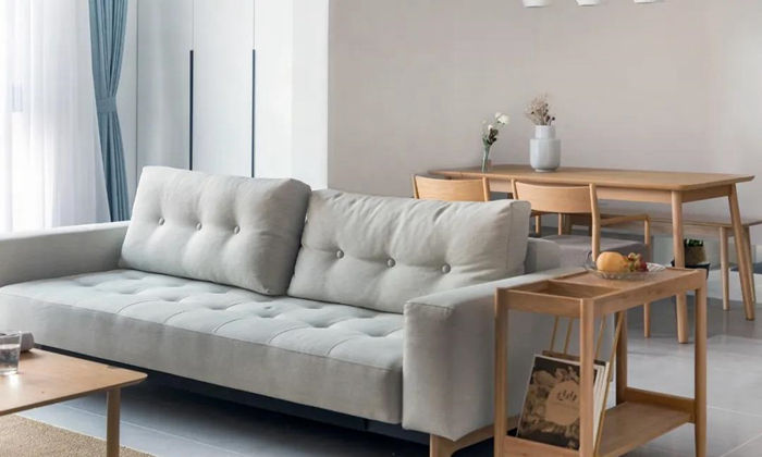 ▲ 布置灰色布藝沙發(fā)搭配木色茶幾與邊幾,簡(jiǎn)約實(shí)用。