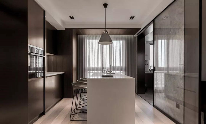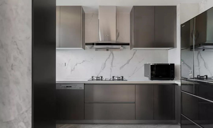 ▲ 廚房采用玻璃移門隔斷,灰色大理石地面搭配白色石紋墻磚,整體定制銀灰色櫥柜體現(xiàn)廚房品質(zhì)感。
