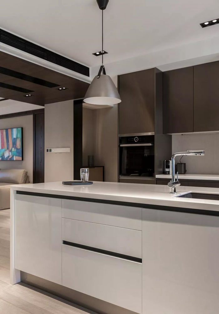 ▲ 靠墻西廚操作區(qū),設(shè)置豎柜嵌入烤箱設(shè)備。