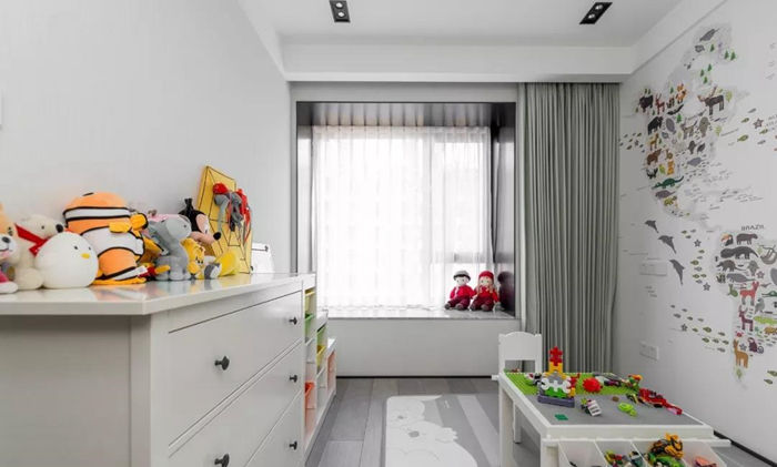 ▲ 兒童房,設(shè)置符合孩子身高的家具,墻面用富有趣味性的動物種類組成了世界地圖。