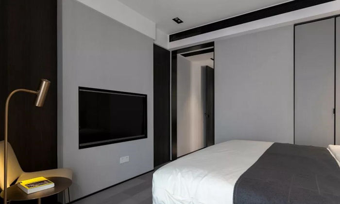 ▲ 客衛(wèi)以黑白灰為主,墻面上木質(zhì)方格的設(shè)置可以用于擺放衣物,洗漱用品,毛巾等,平日里不使用的時候可以將柜門關(guān)閉,以防潮濕。