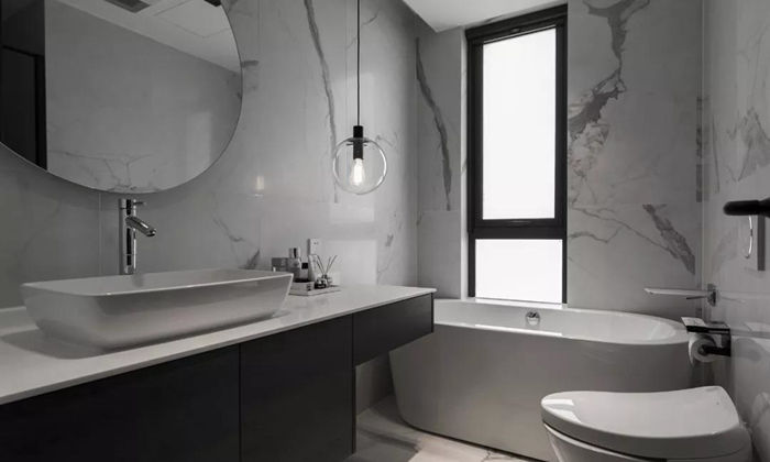 ▲ 主衛(wèi)以白色為主,臺盆柜延伸設(shè)計,增加了浴缸區(qū)收納。