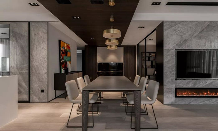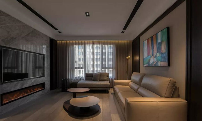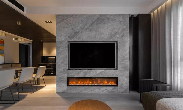▲ 電視墻采用銀灰色石材,內(nèi)嵌式壁掛電視,下方的仿真燃燒壁爐在冷色調(diào)的背景中平衡暖意。