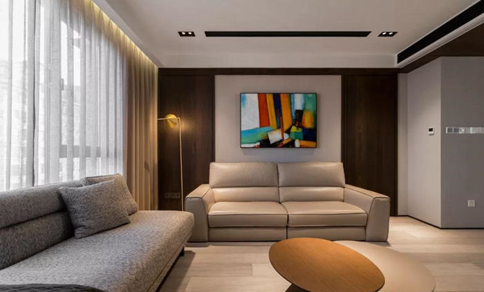 ▲ 布置米棕色皮沙發(fā)與灰色布面貴妃位,木色錯層茶幾簡單不失設(shè)計感。