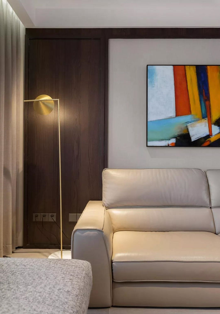 ▲ 背景修飾藝術(shù)油畫,右側(cè)木飾面隱藏臥室門片,落地燈的金屬材質(zhì)具有時尚美感。