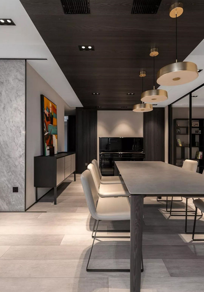 ▲ 客餐廳相連,采光和通風(fēng)良好,灰棕色純木的長方形餐桌搭配米白色軟包餐椅。